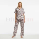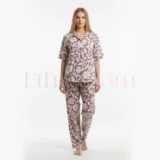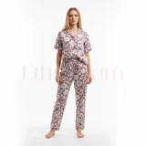 Women’s co-ord set with a loose-fit shirt and elastic waist wide-leg pants in Baby Pink with white abstract print. Light, breathable, non-transparent fabric.