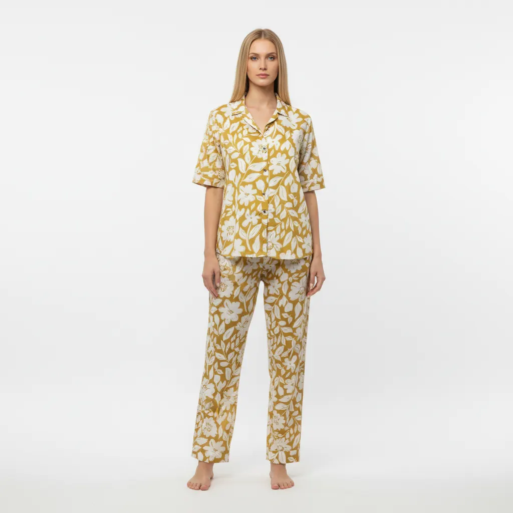 Women’s co-ord set with a loose-fit shirt and elastic waist wide-leg pants in Mustard Yellow with a white floral print. Pants have no pockets. Lightweight, soft, and non-transparent fabric ideal for daily comfort.